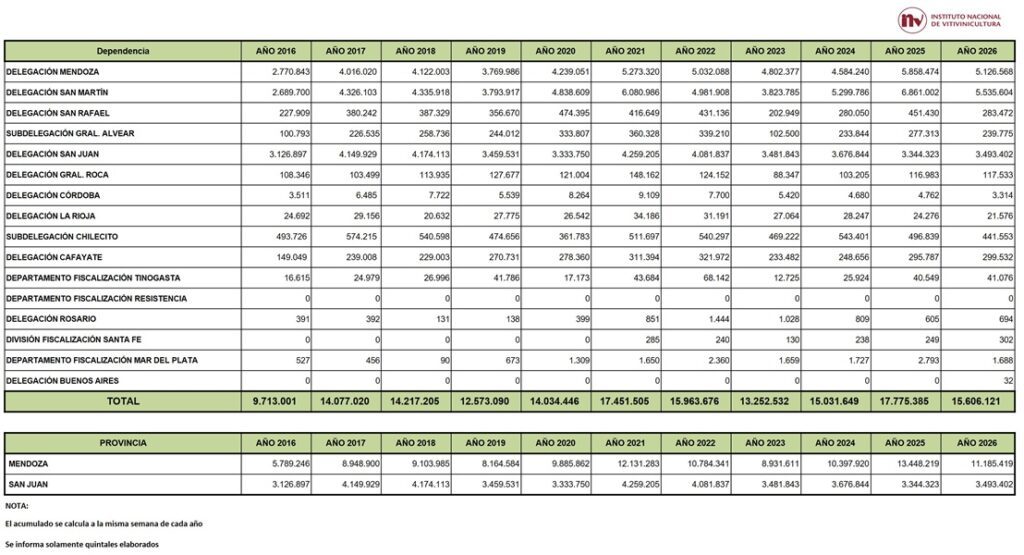 En 18 semanas de vendimia se sumaron 15.606.121 qq de uva, una cosecha 12,2% menor respecto del mismo período de 2025, cuando a ésta altura se habían obtenido 17.775.385 qq.
