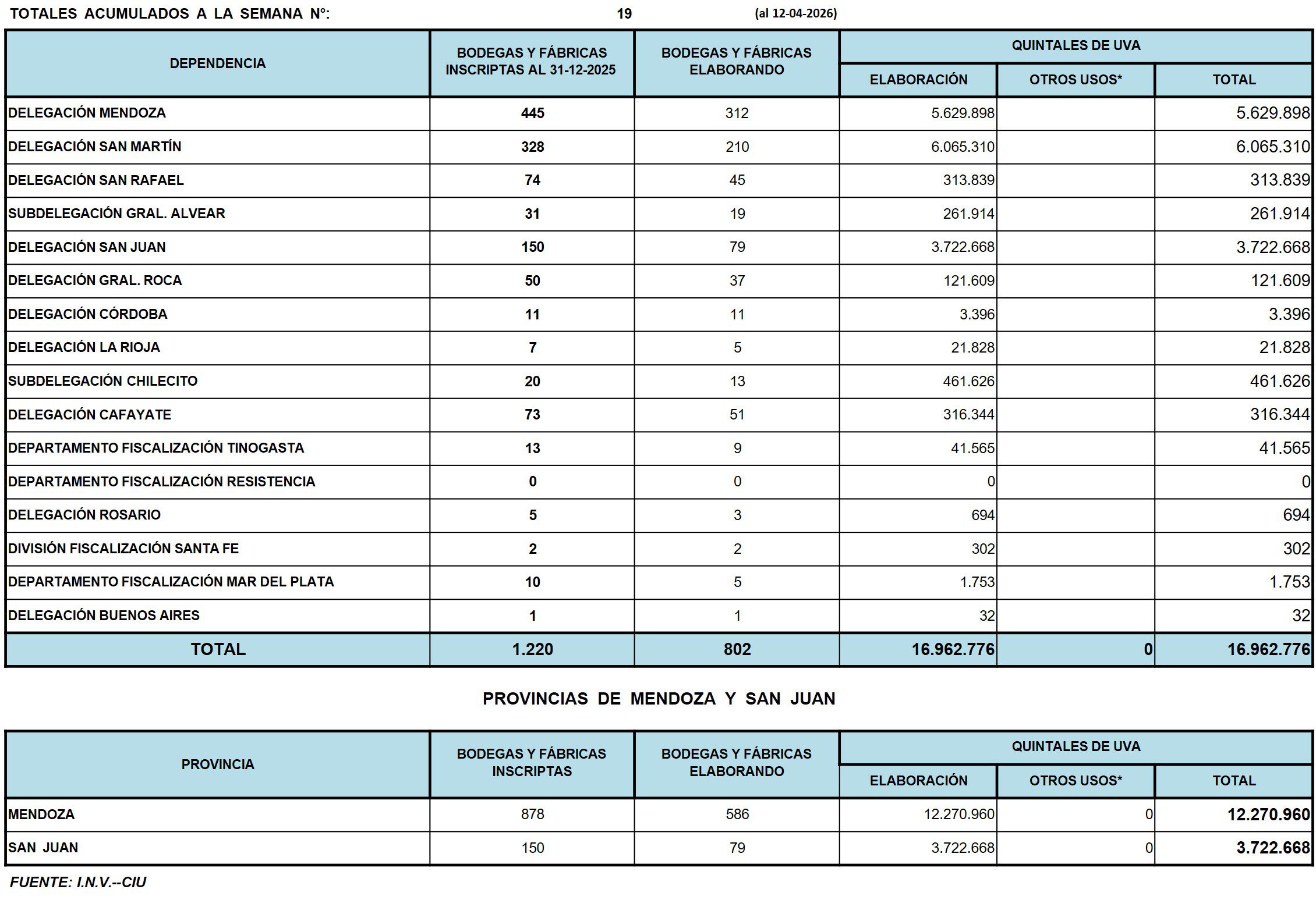 Según las declaraciones juradas de los productores, recibidas por el Instituto Nacional de Vitivinicultura (INV), al 12/4 (semana 19 de iniciada la cosecha de vid), se recolectaron en Argentina 16.962.776 qq de uva, -9,6% que lo cosechado durante el mismo período de tiempo de 2025.