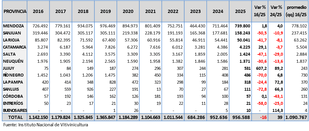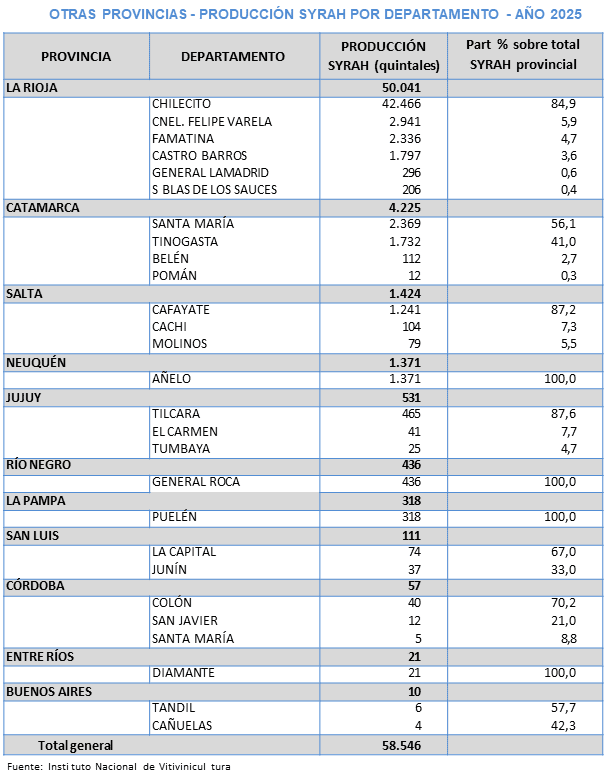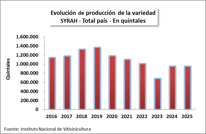 La producción total en el país de la variedad Syrah, en 2025, fue de 956.588 quintales, un 0,4% superior a la del año anterior. La distribución por provincia de origen en los últimos años se muestra en la siguiente tabla: