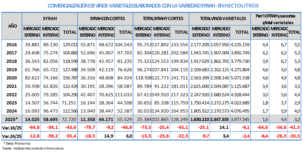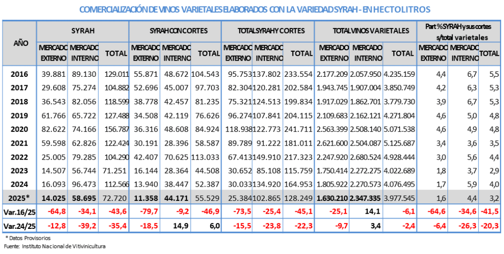 En 2025 se comercializaron 72.720 hl de vino varietal puro de Syrah y 55.529 hl de Syrah en corte con alguna otra variedad. El total comercializado de vinos varietales en el país fue de 3.977.545 hl y las ventas de vinos varietales Syrah (puro+cortes) representaron el 3,2% de ese total.