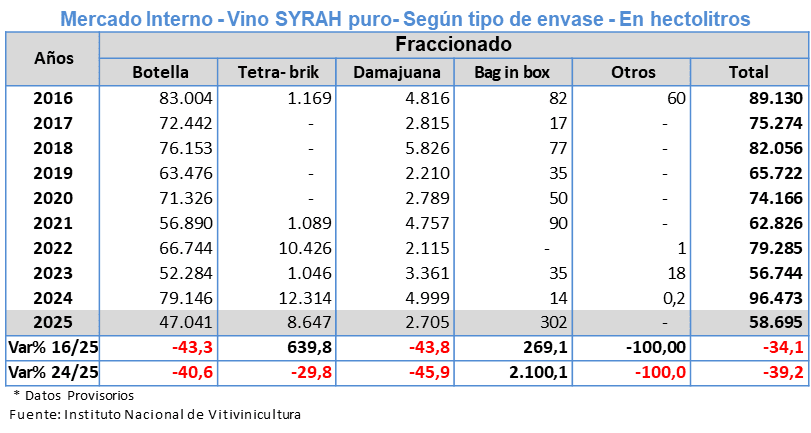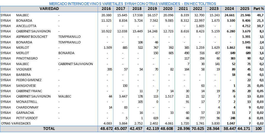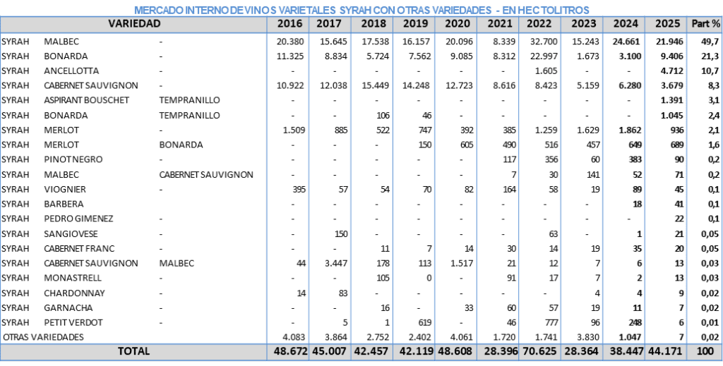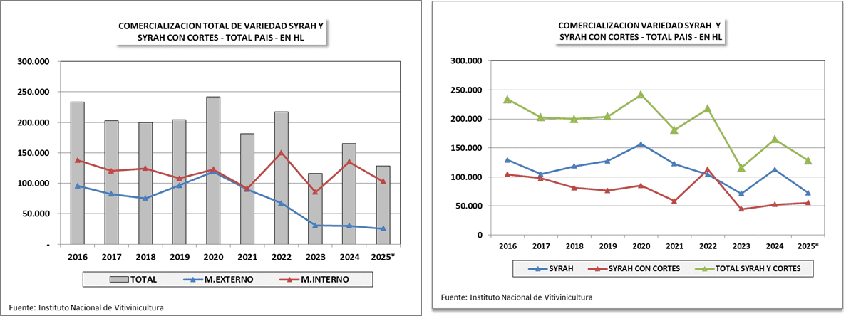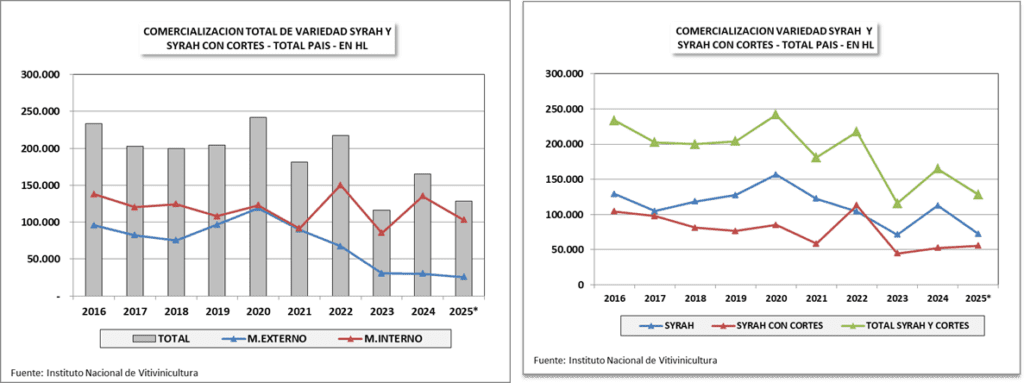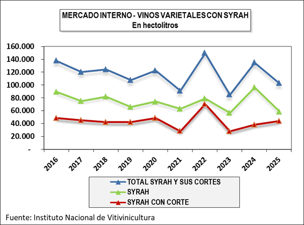 En el año 2025 se comercializaron 102.865 hl de vinos varietales Syrah (puro + cortes). El 57% corresponde a varietal puro y el 43% a cortes con otra variedad. Las ventas al mercado interno de vinos con Syrah han disminuido en el último año, mostrando una baja del 23,8% respecto al año 2024.