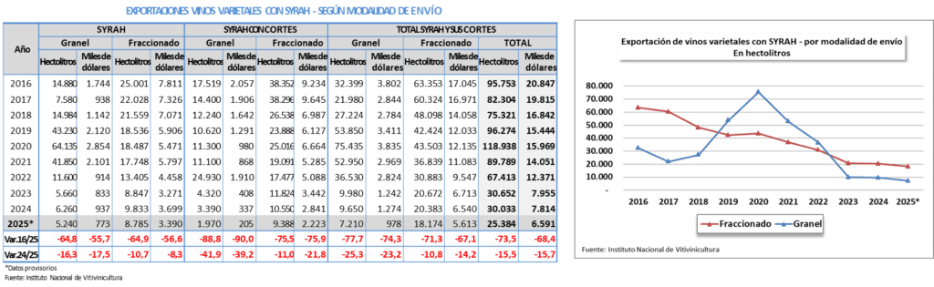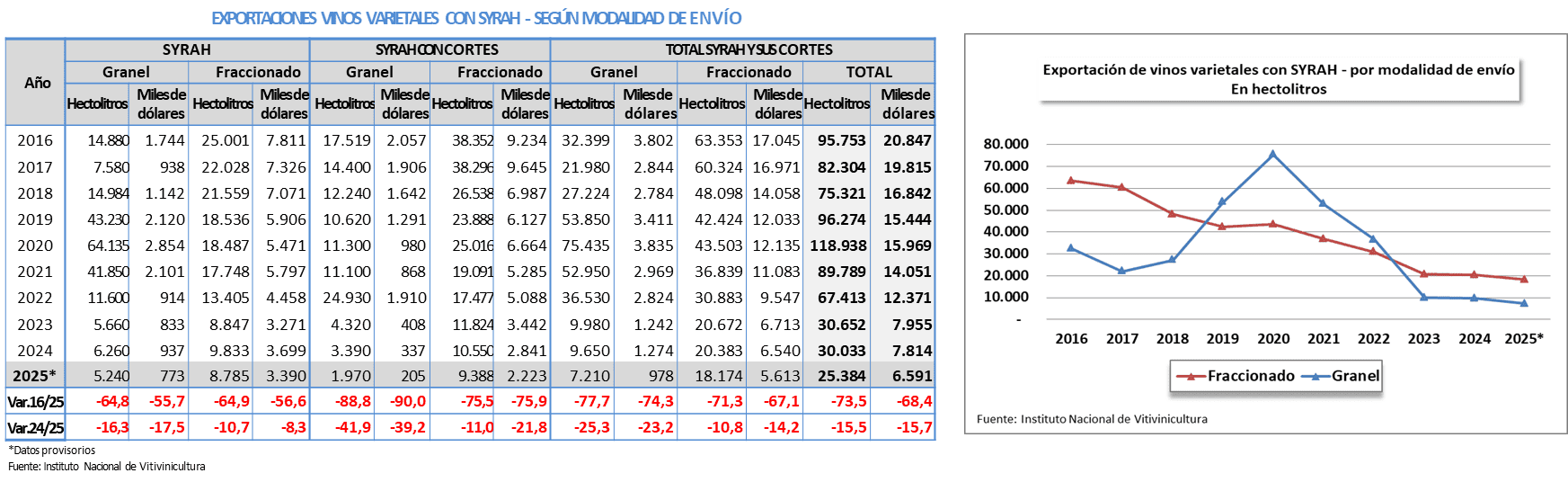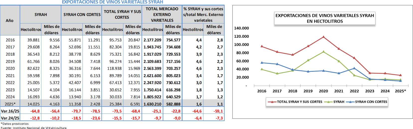 Durante el año 2025 las exportaciones de vinos varietales elaborados con la variedad Syrah alcanzaron un total de 25.384 hl, por un valor FOB de 6.591.000 dólares. Las exportaciones de este varietal han disminuido en volumen un 73,5% y en valor un 68,4% con respecto al año 2016. En el último año también se observa una disminución, llegando a exportar un 15,5% menos en volumen que en 2024.