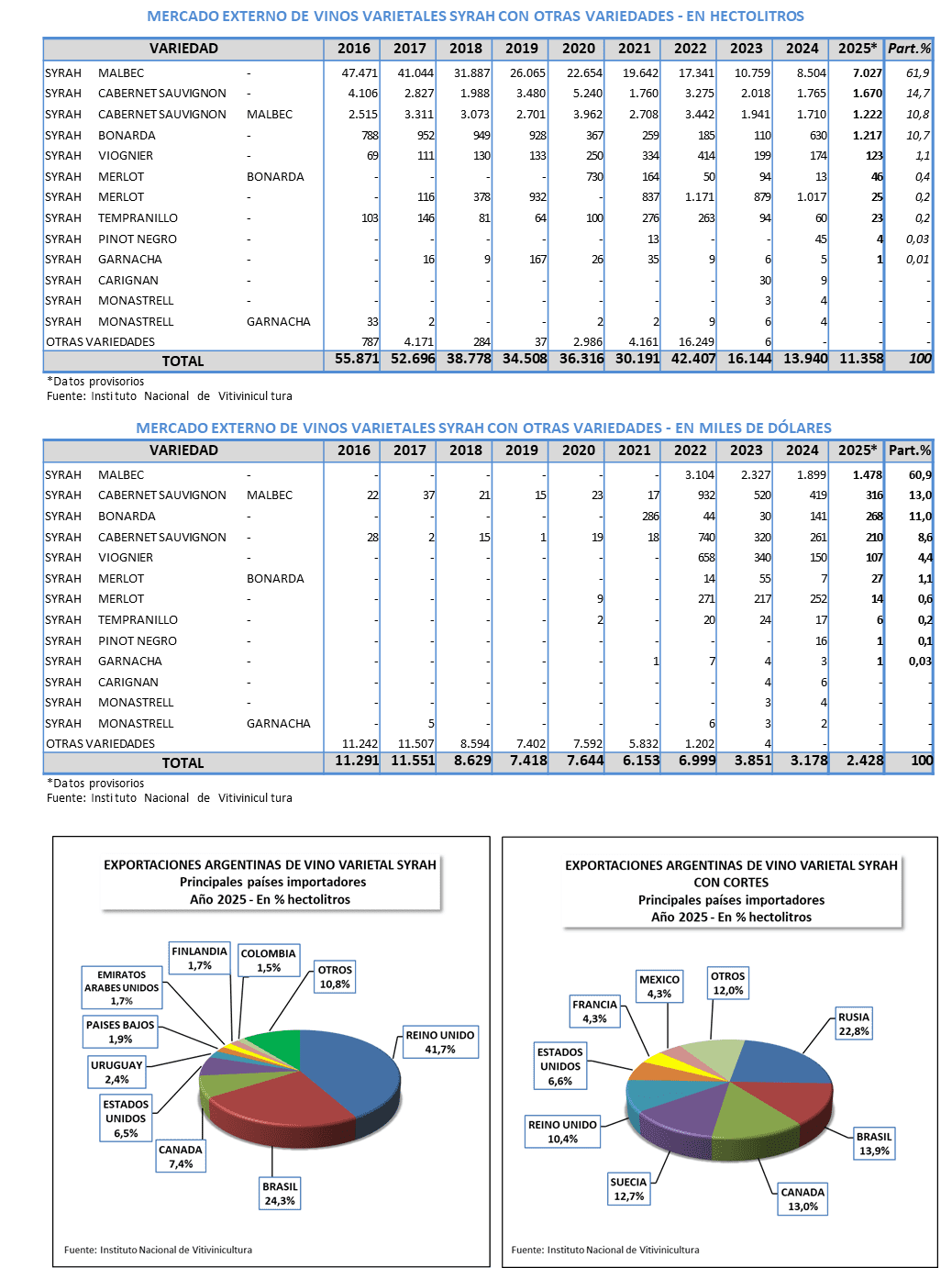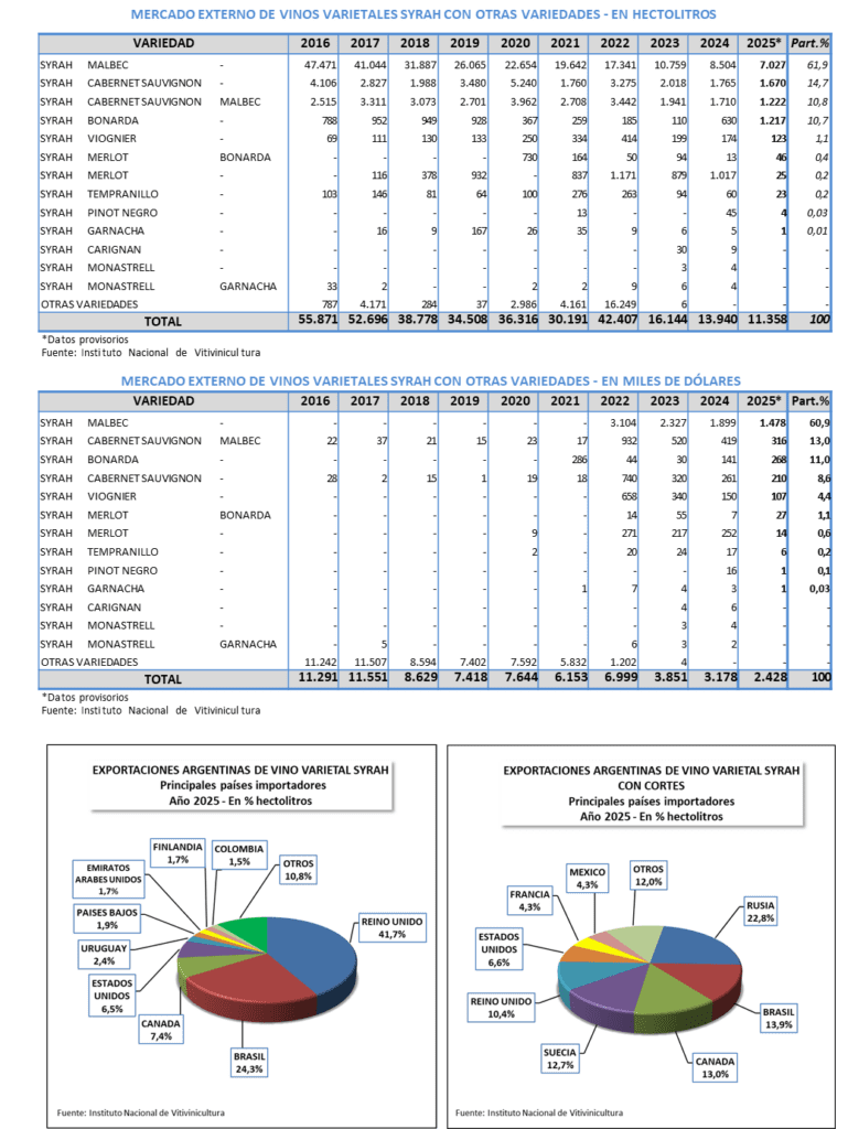 El principal destino de los vinos varietales puros Syrah en 2025 fue Reino Unido, seguido por Brasil, Canadá, Estados Unidos, Uruguay y Países Bajos. Mientras que para Syrah con cortes, los principales destinos fueron Rusia, Brasil, Canadá, Suecia, Reino Unido y Estados Unidos.