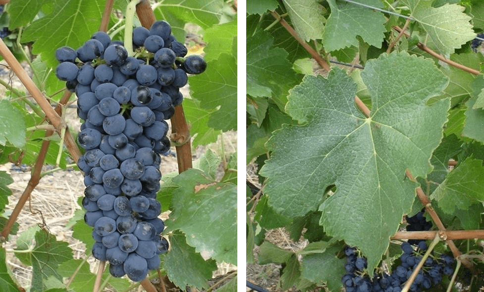 Ampelográficamente se puede distinguir por su hoja trilobada mediana plegada con su lóbulo central plano y con los lóbulos laterales doblados o plegados hacia arriba, de color verde opaca, con indumento en telaraña abundante, seno peciolar en U con tendencia a lira y punto peciolar blanquecino. Racimo mediano, bien lleno a compacto, cilíndrico con pedúnculo bastante largo. Las bayas son elípticas color negro azulado, medianas, de sabor neutro y pulpa blanda.