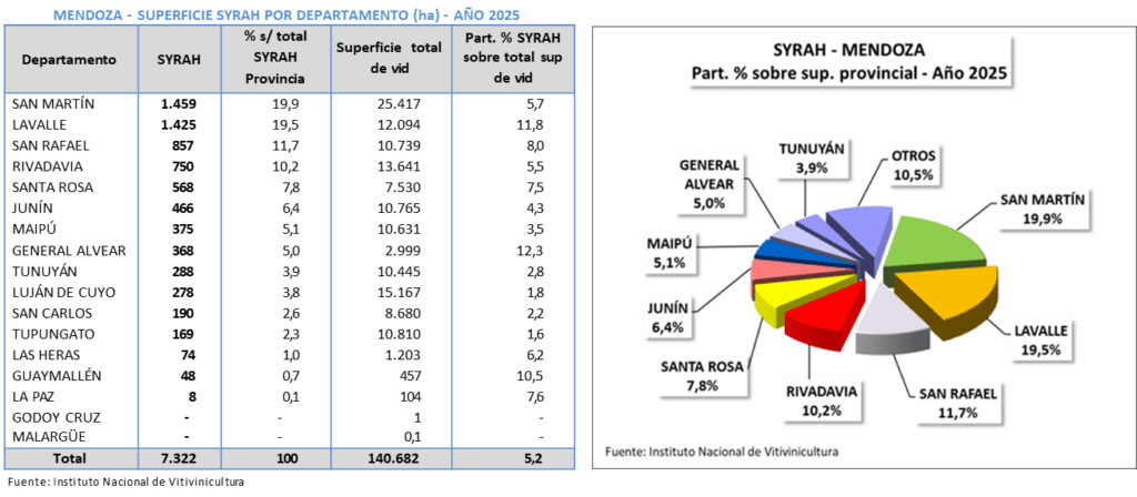 En la provincia de Mendoza la mayor superficie de Syrah se encuentra en los departamentos de San Martín (19,9%), Lavalle (19,5%) y San Rafael (11,7%), seguidos por Rivadavia (10,2%) y Santa Rosa (7,8%). Los 5 departamentos de la Zona Este totalizan el 44,4% de SYRAH de la provincia.