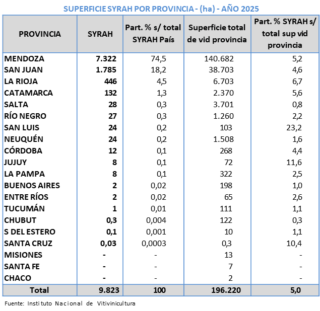 La provincia de Mendoza tiene la mayor cantidad de Syrah del país, alcanzando en 2025 las 7.322 ha (74,5%), seguida por San Juan con 1.785 ha (18,2%) y el resto de las provincias con 715 ha (7,3%).