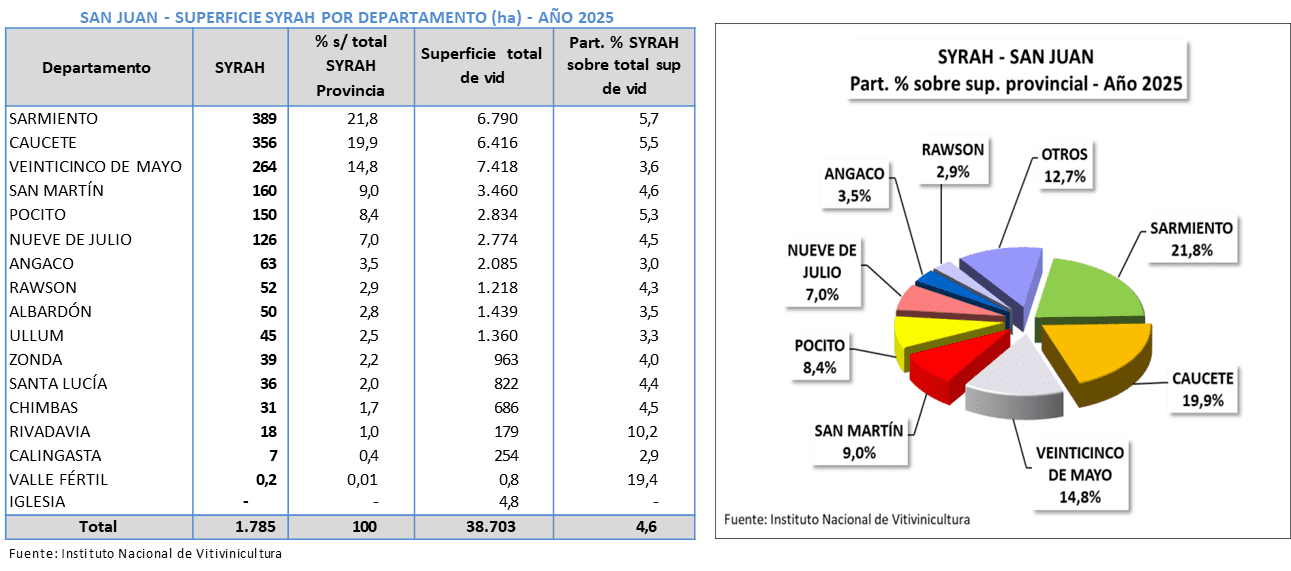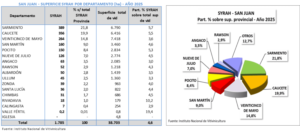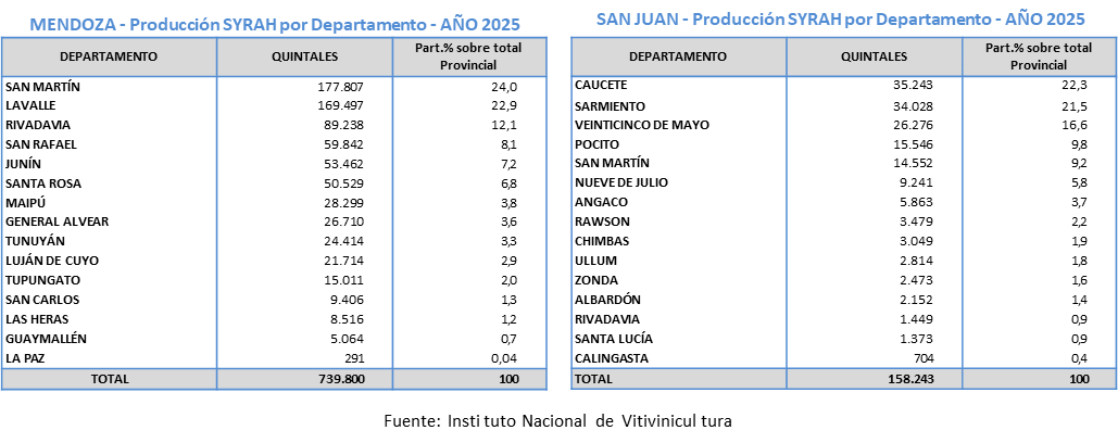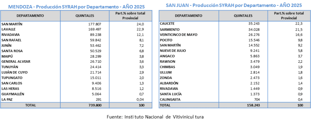 En la provincia de Mendoza los departamentos que más quintales de Syrah cosecharon en 2025 fueron San Martín, Lavalle y Rivadavia. En San Juan se cosechó más Syrah en Caucete y Sarmiento. La producción de Syrah 2024 por departamento de origen en cada provincia se muestra en los siguientes cuadros: